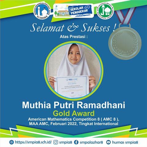 Selamat dan Sukses atas Prestasi Ananda Muthia Putri RamadhaniKelas 9 A – SMPI Al Azhar 8 Bekasi. berikut prestasi yg diraih kak Muthia :1. Gold award, American Mathematics Competition 8 ( AMC 8 ), MAA AMC, Februari 2022, Tingkat international 2. Honor Roll, for score in the top 5% on The AMC 8, MAA AMC, […]